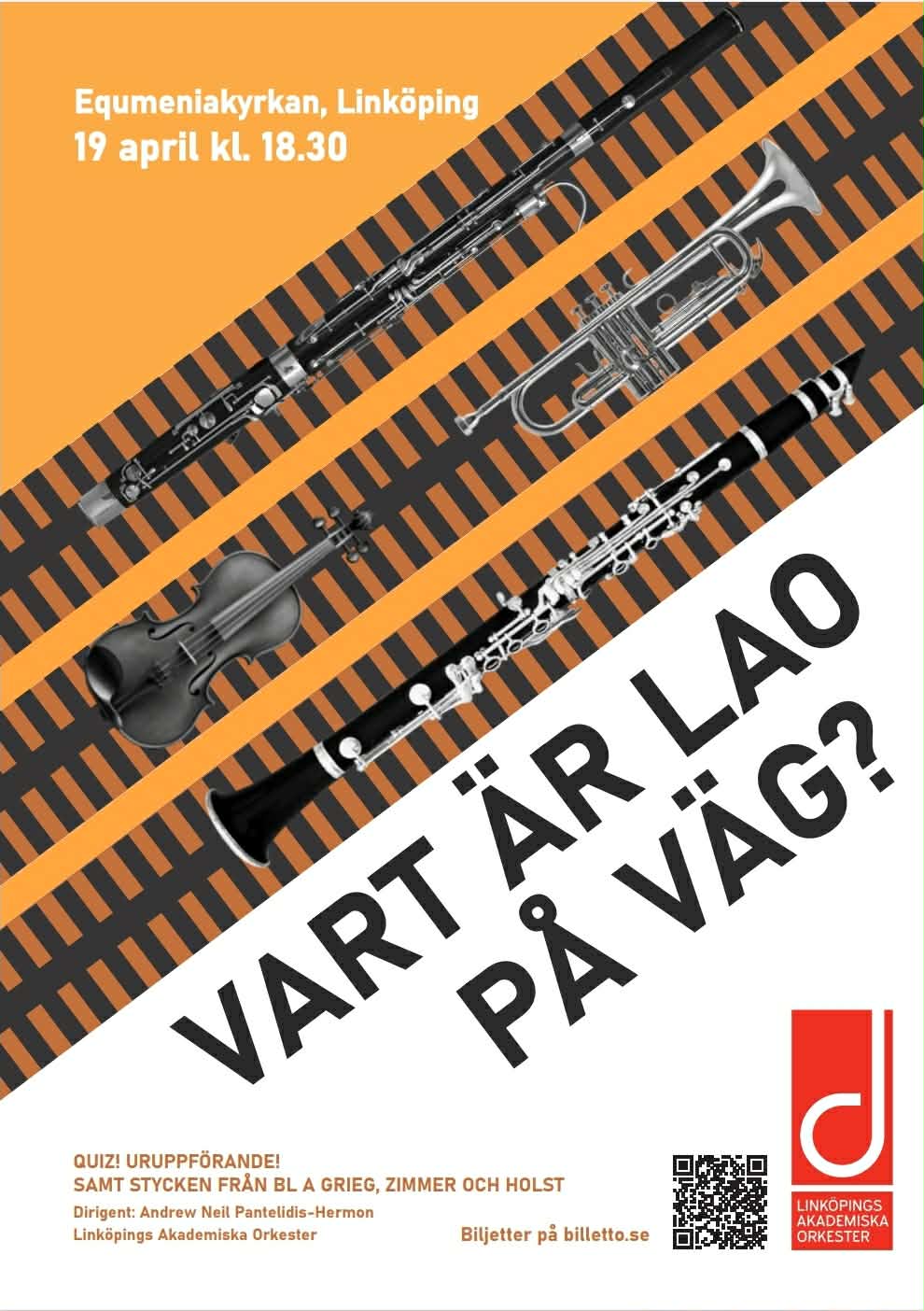 Söndag den 19:e april kl 18.30 bjuder Linköpings Akademiska Orkester in till konsert i Equmeniakyrkan, under ledning av dirigent Andrew Neil Pantelidis-Hermon.